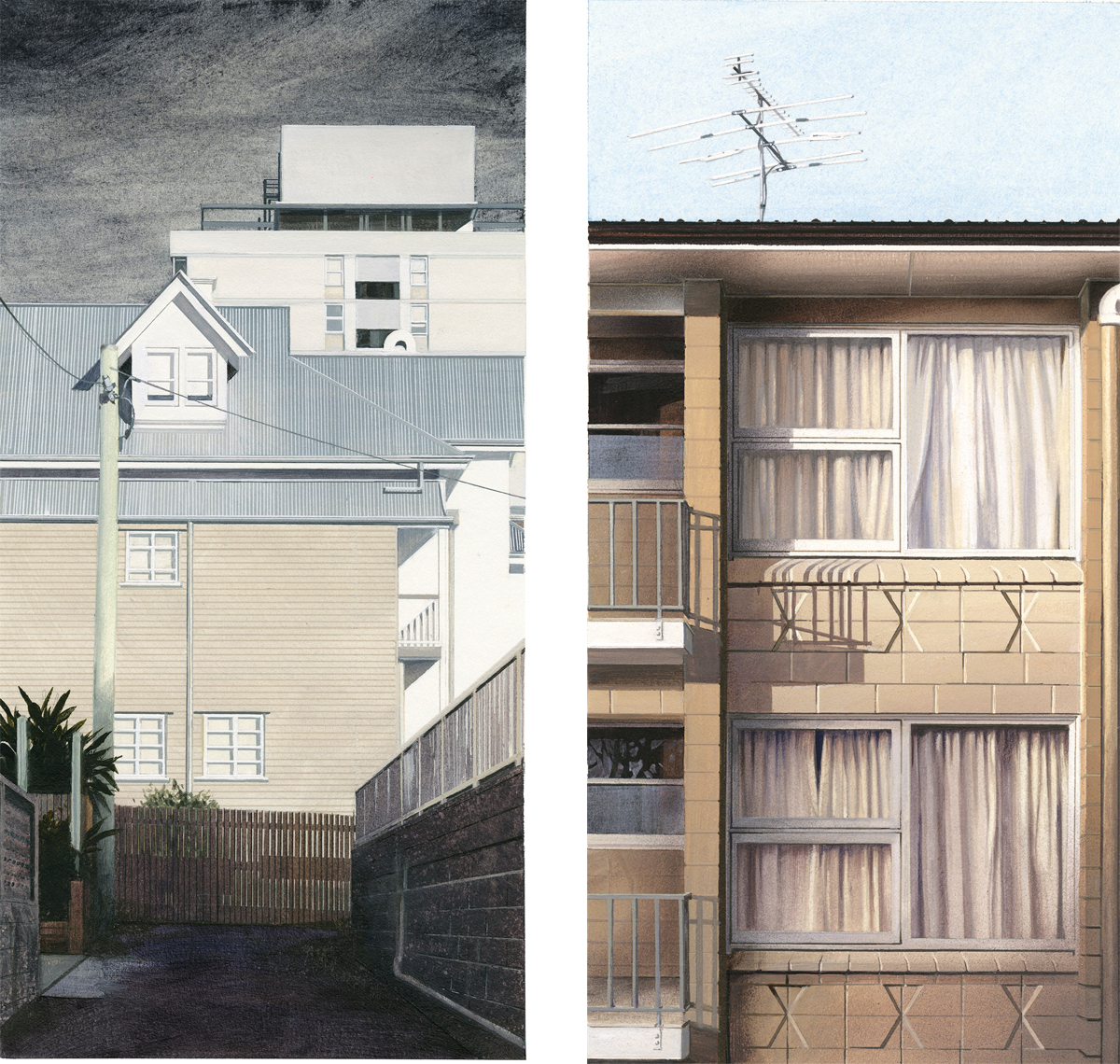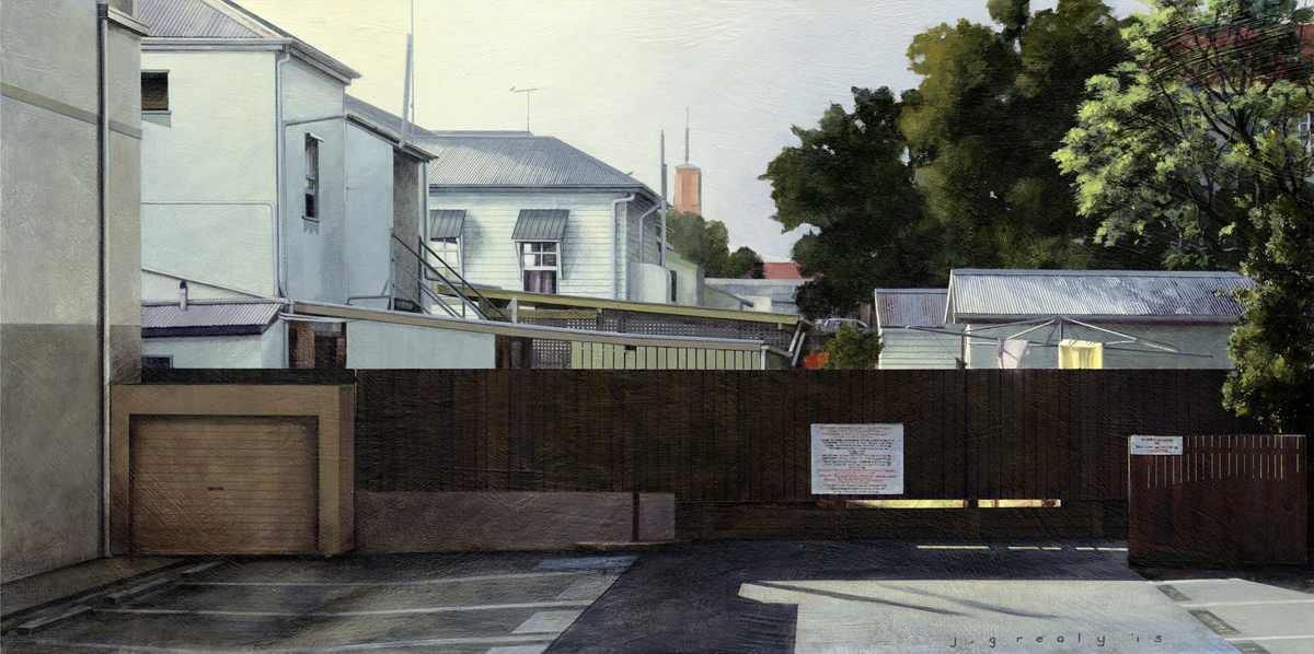 For this exhibition I am painting and drawing subjects of my choice – the less examined architectural fabric and detail of New Farm where I have lived for thirty years. I am interested in the remnant spaces and landscape between and behind buildings, and buildings that are unassuming, which may not even register with passers by. Are these places used and familiar to people or are they unnoticed, even abandoned?