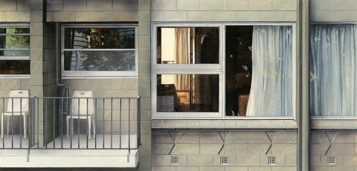 I live next door to a large block of flats that overlooks our house. The screening landscape between us has gone and our windows, balconies and verandas face each other. It seems to me both sides employ a discretion reminiscent to the one David Malouf describes of living in Queenslanders – that of “not seeing and not hearing”. Our discretion is not to look directly at each other, and to only occasionally acknowledge each other’s presence, to ignore outbursts, indiscretions. On long walks home from school as a child, I enjoyed looking at houses, assessing which was the most attractive, looking at the windows for signs of how those inside lived. Many of the paintings in this exhibition are views from my home looking out.