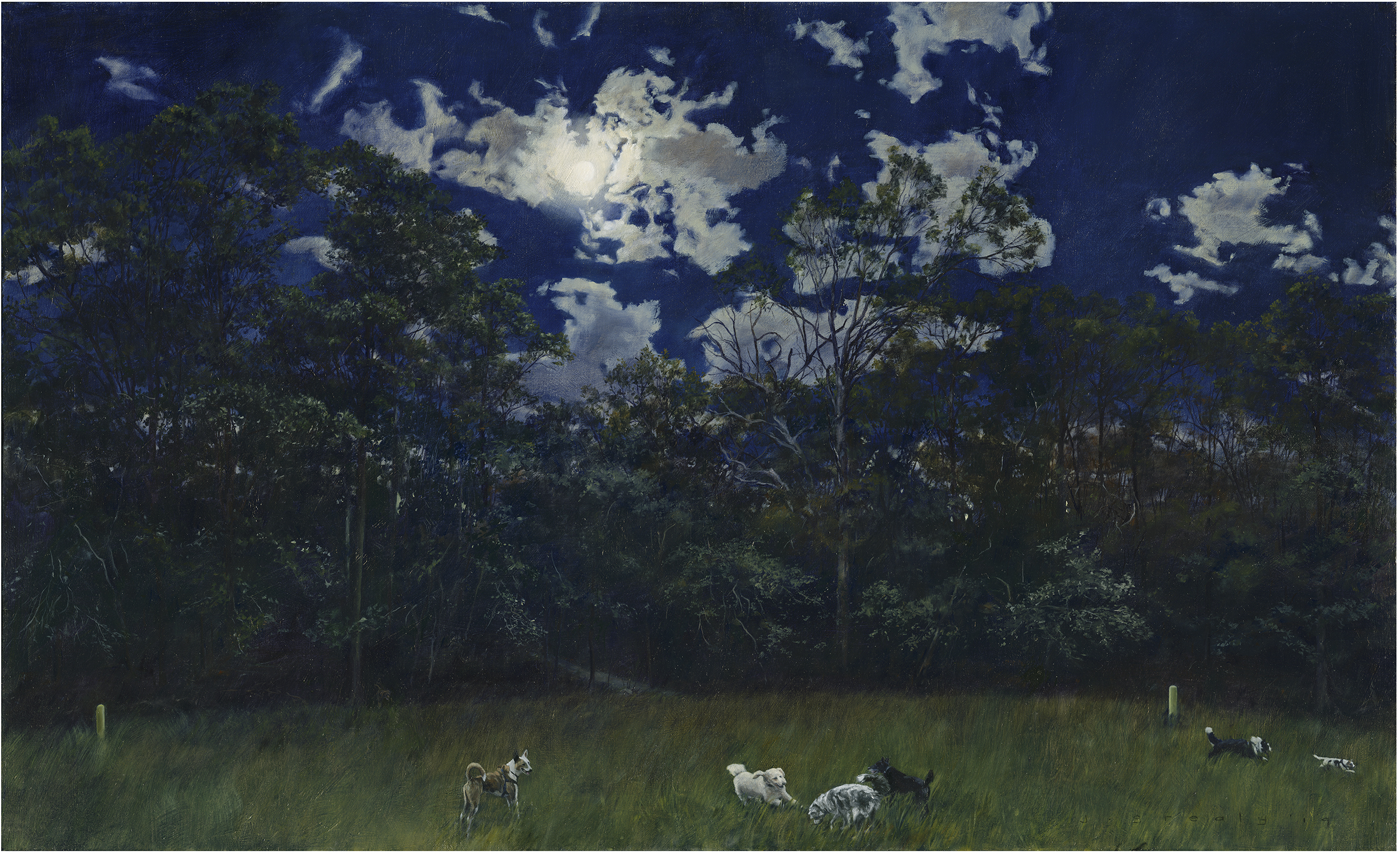 Much of the time, dog park is empty of people. Tall trees and birdsong conceal the fact that the park lies within a highly urbanised inner-city suburb. I often wonder what ensues when no one is around. This painting is not an observation of an event, but my imagining of dogs and of this space. The only actuality is the painting.